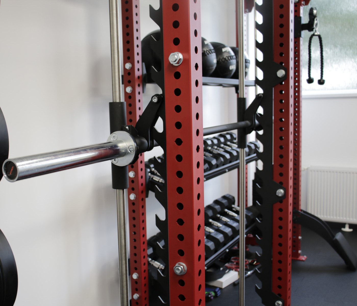 Chtěli byste prvky doplňku Smith machine v jiné barvě? Máte naši konstrukci v netradiční sestavě a překážejí vám komponenty na kleci? Smith machine dokážeme také přizpůsobit – existuje mnoho řešení, stačí nás kontaktovat.